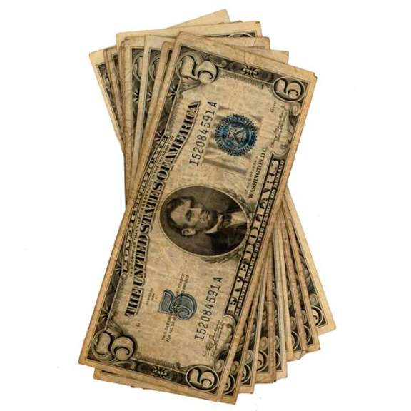 10 1934 Various Series $5 Blue Seal Silver Certificates.1934  A C D Series. Generally nicer than the top note. Corners all there. No pin holes tears or graffiti.