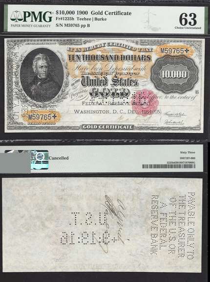 Highly Collectible $10,000 Gold Certificate These notes have been cancelled this is why they can be sold below face value. 1935 there was a fire in the Post Office. Along with government records there were also $10,000 cancelled notes that were thrown out the window. Onlookers picked these notes up and took them home only to find out they were not able to spend since they have been cancelled. Most of the notes have water damage, charring and are circulated. Note is graded by PMG as Choice Uncirculated 63