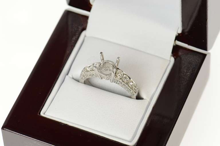 You are bidding on a 18K White Gold 0.30 Ctw Diamond 6.8mm Engagement Setting Ring. This item has a composition of 18k Gold Marked. This is beautifully accented with 0.304 Ctw=36x Diamond. The item's condition is Estate:Good. This item has a weight of 4.7 grams. We would consider this piece to be Vintage. This ring is size 6. Notes on this item are: This engagement setting would accommodate a stone approximately 6.8mm in diameter