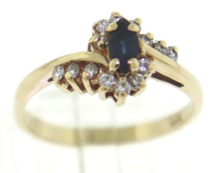 This Beautiful 14kt Yellow Gold Ring features a Marquise Cut Blue Sapphire Center highlighted with Round Cut Diamonds set into a Swirled Halo Ring.  This ring weighs approx. 3.40 Grams.  **