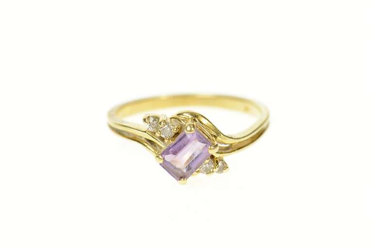 You are bidding on a 14K Yellow Gold Emerald Amethyst Diamond Freeform Bypass Ring. This item has a composition of 14k Gold Marked. The center gemstone is 1x=Amethyst. This is beautifully accented with 4x=Diamond. The item's condition is Estate:Good. This item has a weight of 2.4 grams. We would consider this piece to be Vintage. This ring is size 6.75.