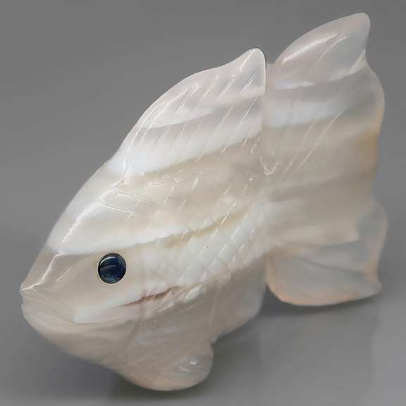 This charming piece is carved out of snow white agate that moves between opaque and translucent giving it the illusion of life and movement. Its sapphire cabochon eyes have a glossy liquid luster, and it measures an impressive 41mm x 31.8mm x 12mm. This is an untreated hand carved gemstone collectable.