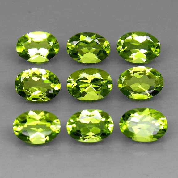 This is a 9 piece high fire parcel with flashing for days. You can't tell whats brighter in these pieces, the color, or the sparkle. They have vivid lime green hues with exceptional lusters that add to their display. These all natural peridot measure approximately 6x4mm each with VS clarity, and were sourced fom Pakistan. Unheated.